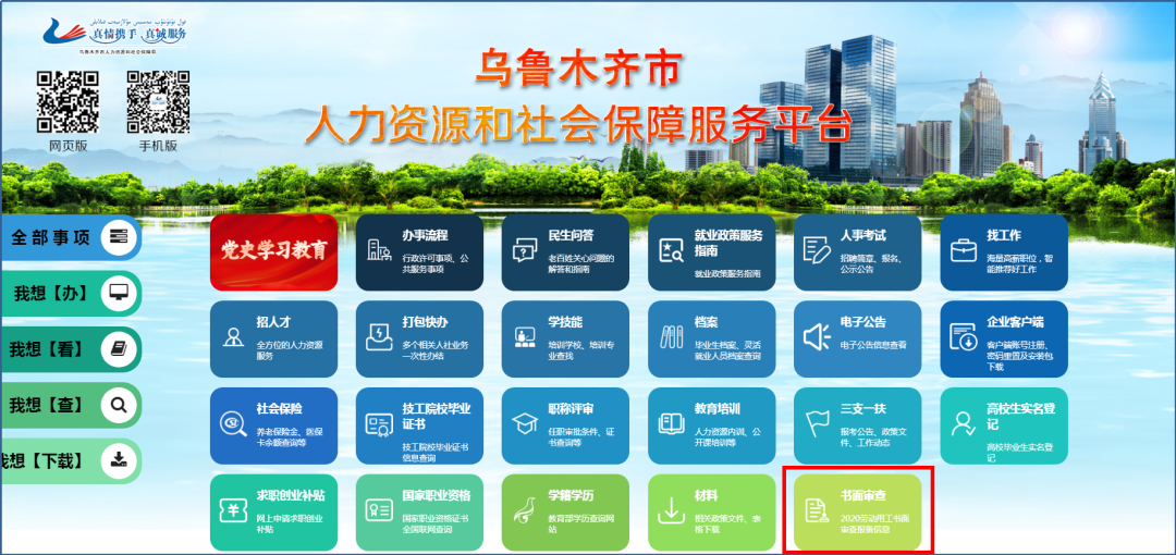 访问“乌鲁木齐市人力资源和社会保障服务平台”(http://www.wlmqrc.com/),点击“书面审查”进入乌鲁木齐市人力资源和社会保障公共服务平台,如下图: