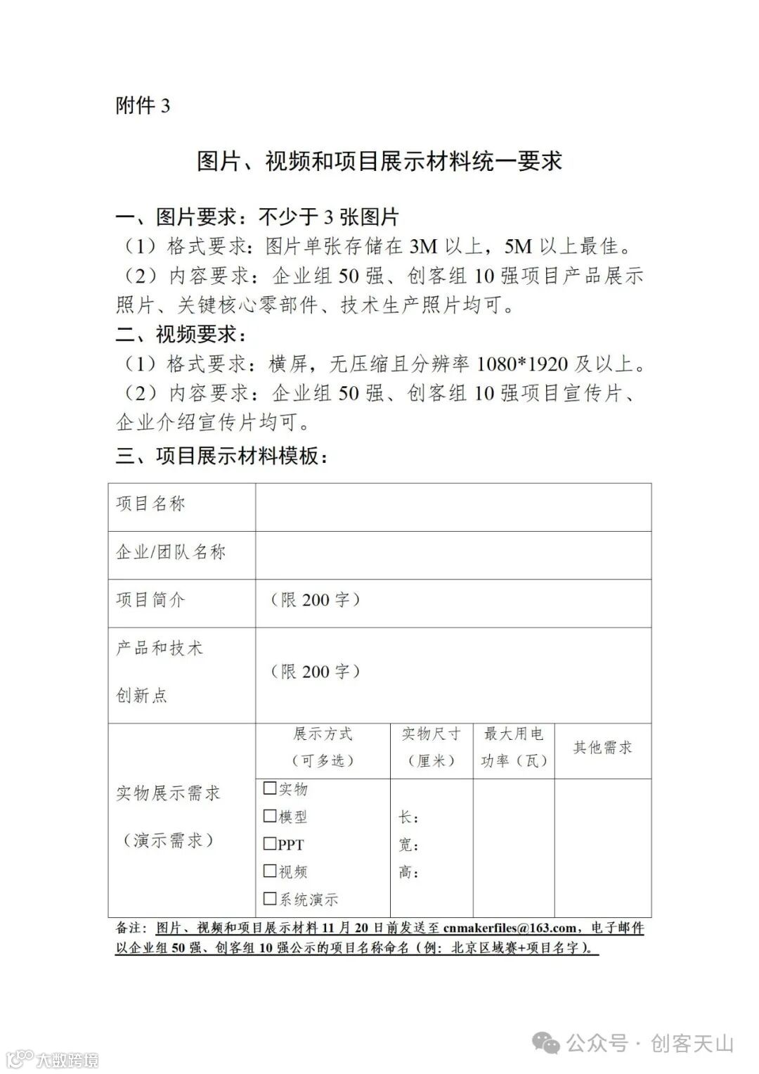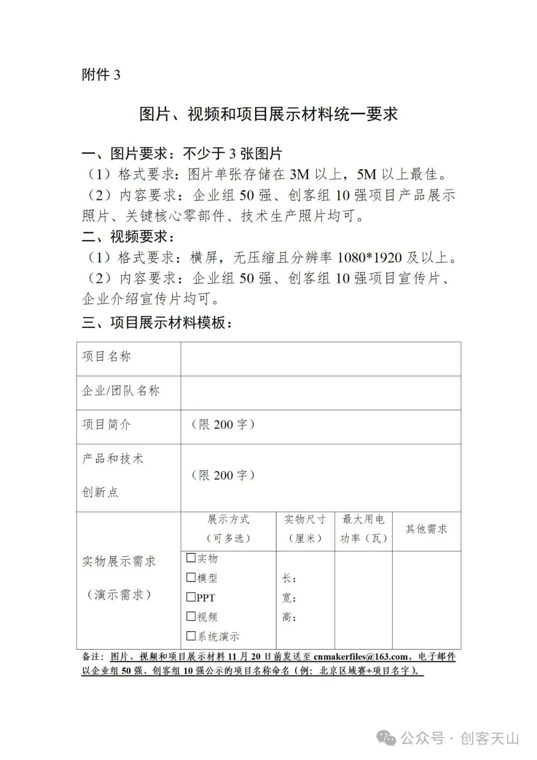 (二)请各赛事主办单位组织入围第九届“创客中国”中小企业创新创业大赛全国企业组50强、创客组10强项目报送参赛回执和展览展示材料(图片、视频和项目展示材料统一要求见附件3),并于11月20日前发送至指定邮箱cnmakerfiles@163.com。