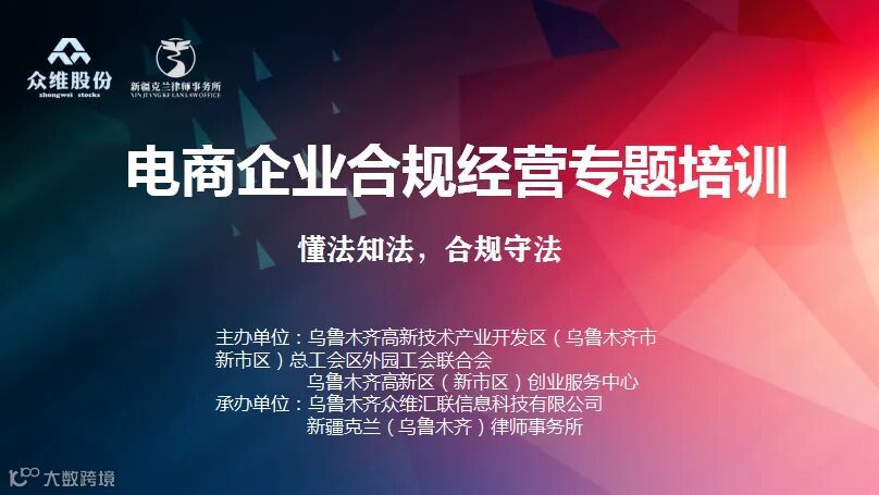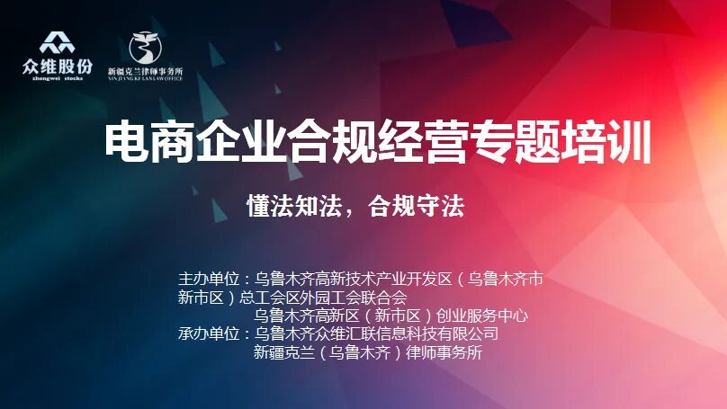 为响应园区电子商务企业的需求,帮助园区电子商务企业及时了解相关法律法规,降低经营风险,获得安全、稳定、持续、健康的发展,由乌鲁木齐高新技术产业开发区(乌鲁木齐市新市区)总工会区外园工会联合会、乌鲁木齐高新区(新市区)创业服务中心联合乌鲁木齐众维汇联信息科技有限公司、新疆克兰(乌鲁木齐)律师事务所共同组织本期电商企业合规经营专题培训活动。