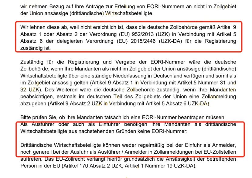 “从2020年11月至今为贵公司客户提交的各种EORI申请”。海关总署拒绝了我们的申请”,表示中国卖家作为第三国经营者不需要EORI号码。