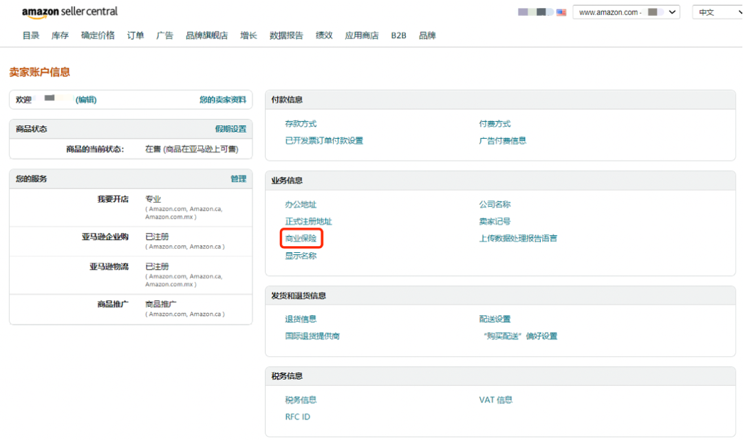 进入卖家平台→选择“设置” →选择“账户信息” →在“业务信息栏”中点击“商业保险”→默认第一步“获取保险”。