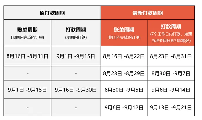 新规则首次执行时间段:账单周期为8月16日-8月22日,打款周期为8月23日-8月31日。