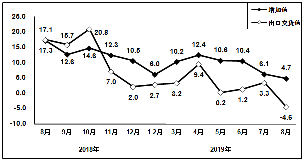 8月,规模以上电子信息制造业增加值同比增长4.7%,增速比去年同期回落12.4个百分点。1-8月份增加值同比增长8.5%,增速比去年同期回落4.8个百分点。