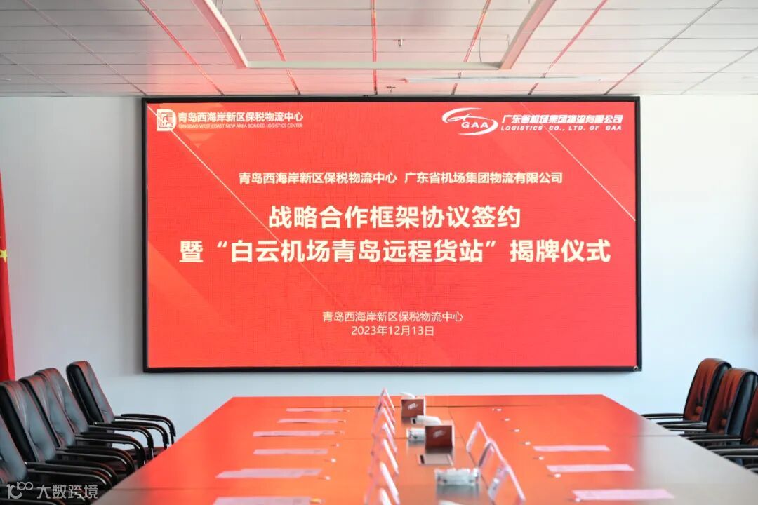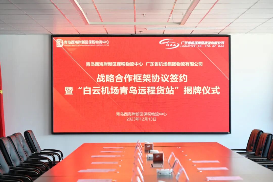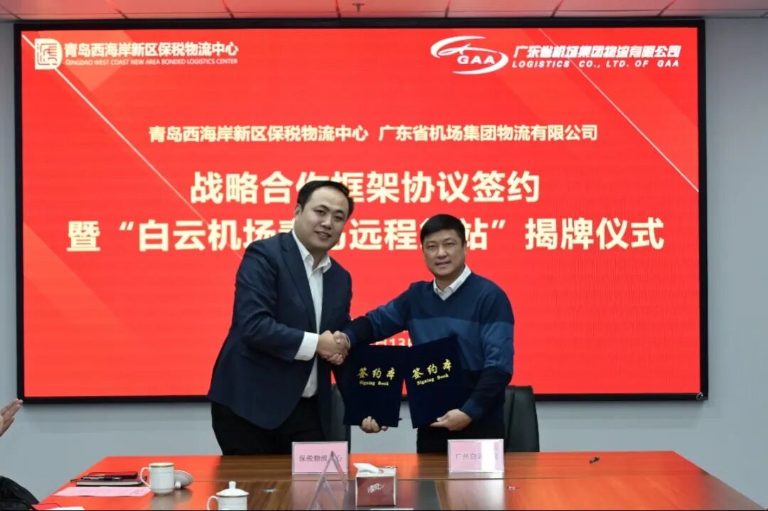 12月20日,广东省机场集团物流有限公司(以下简称“物流公司”)与青岛西海岸新区保税物流中心有限公司(以下简称“保税物流中心”)战略合作框架协议签约暨“白云机场青岛远程货站”揭牌仪式在山东省青岛市举行。青岛西海岸新区保税物流中心首席执行官马骥、广州小白供应链管理有限责任公司总经理吴祖峰、特邀企业代表共同出席并见证仪式。