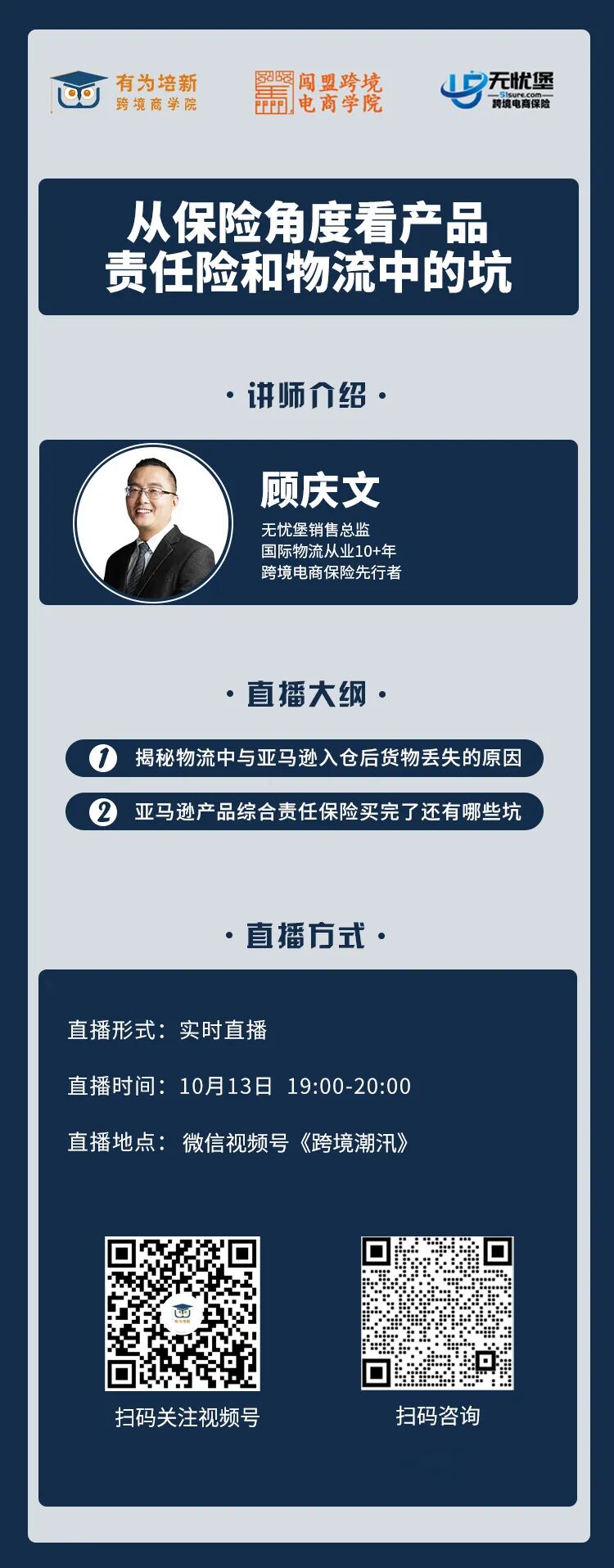 10.13号首场直播将为大家揭秘亚马逊的物流相关信息!想要避坑的卖家朋友就赶紧带上您的小板凳,关注有为培新视频号,收看直播吧!