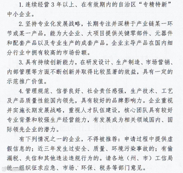 温馨提醒:各地(州、市)中小企业主管部门负责组织推荐和初核工作。请各地(州、市)工信局于3月31日前将有关申报材料报自治区工信厅企业处。过期不予受理,同时不接受企业单独上报的材料。