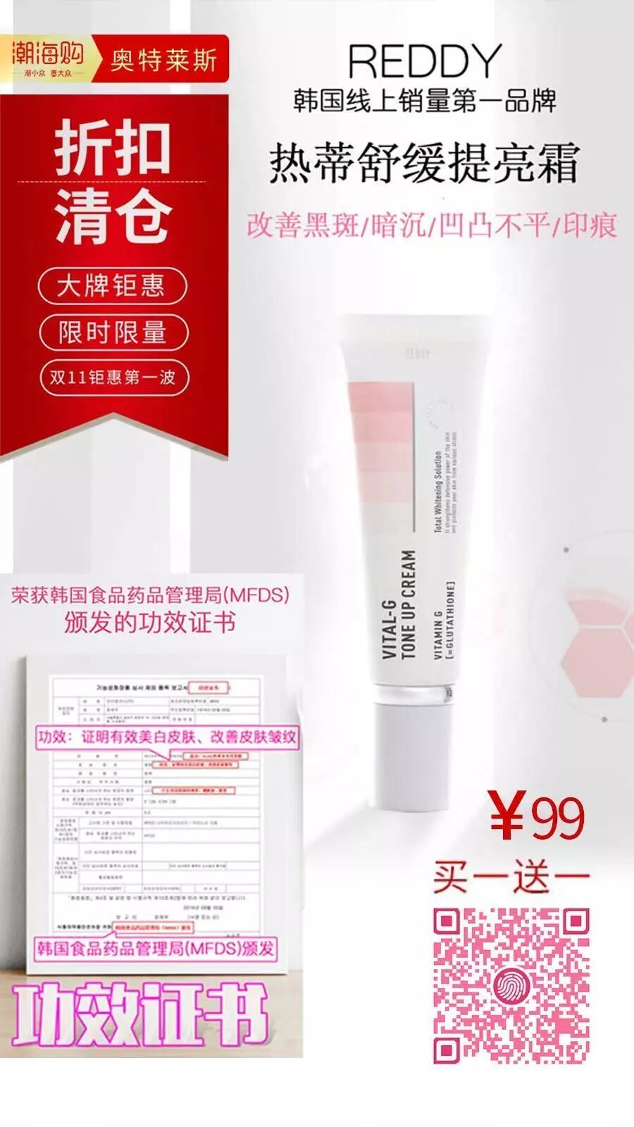 韩国进口 Reddy热蒂 美白舒缓提亮霜80g【保质期至2020.3】