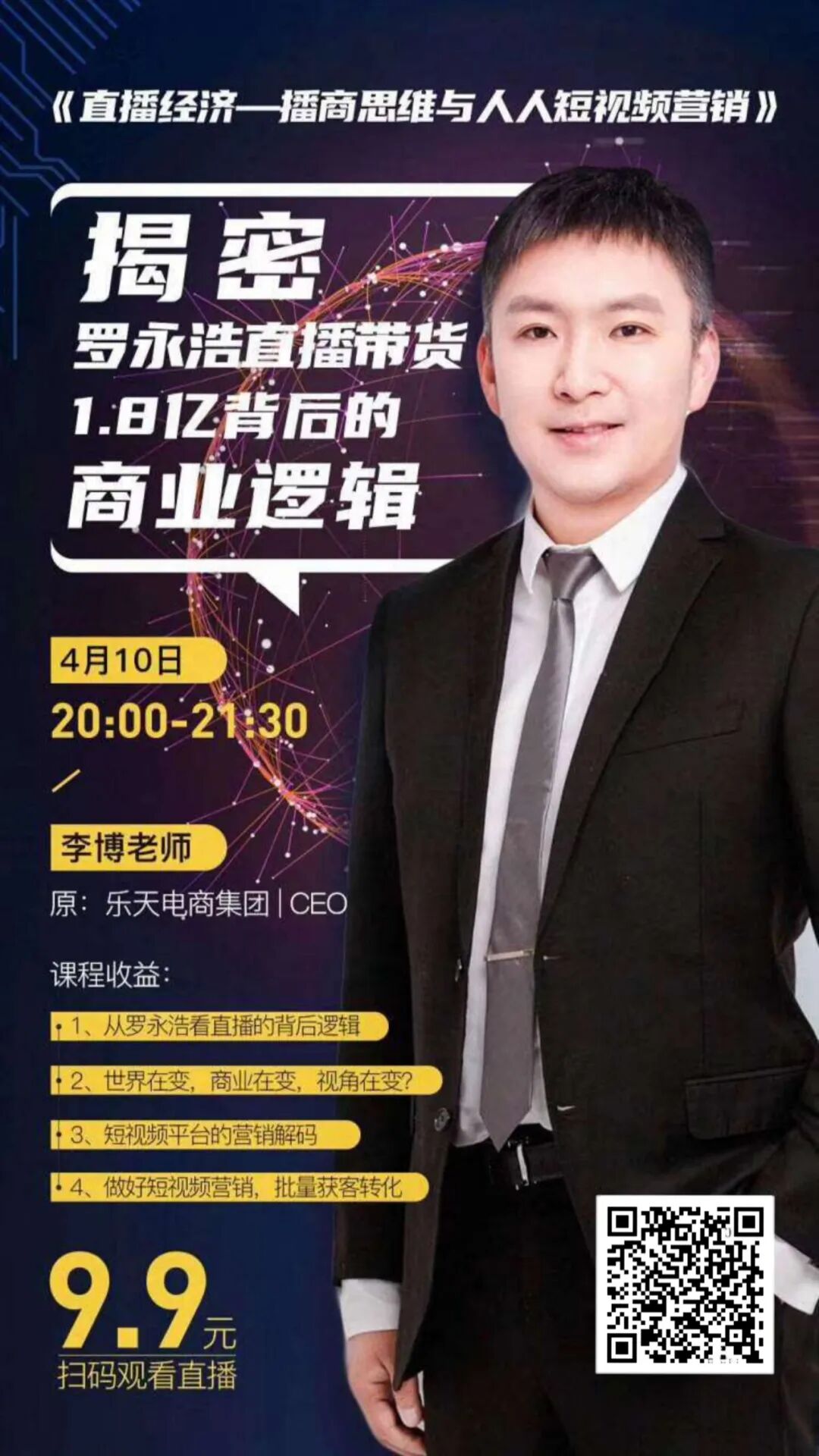 今晚,一起走进李博老师的《直播经济—播商思维与人人短视频营销》课程,为大家揭秘——罗永浩老师直播背后的商业秘密解析。