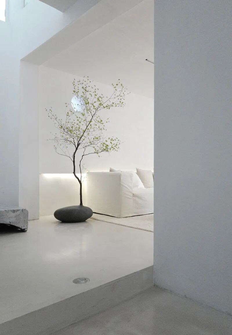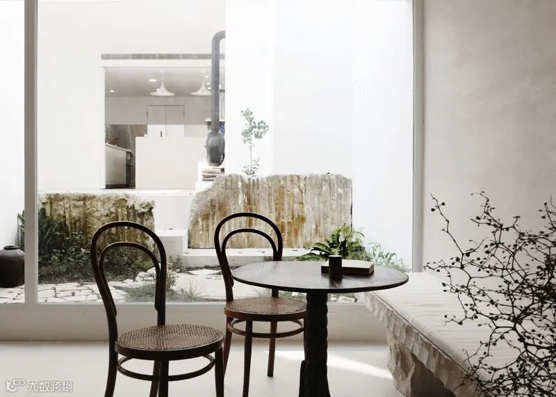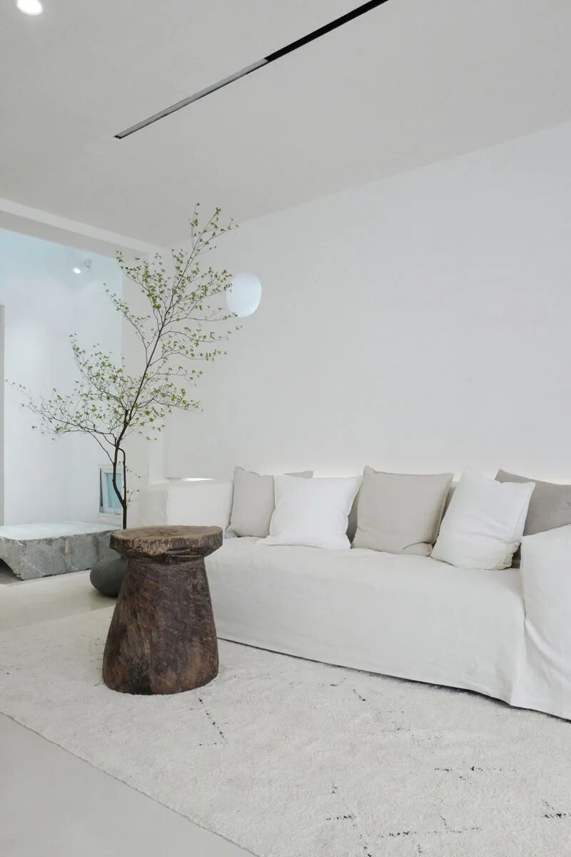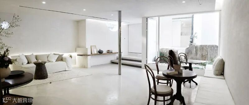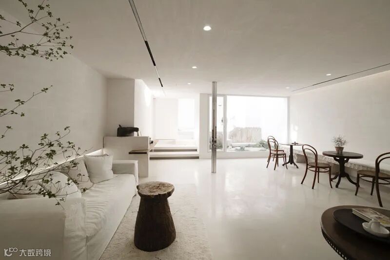 白色的主体色在一定程度上增加了空间的空旷及延伸感觉,在朝向院子及山体的南向,全部用落地玻璃打开,在室内就可以直接面对山林。