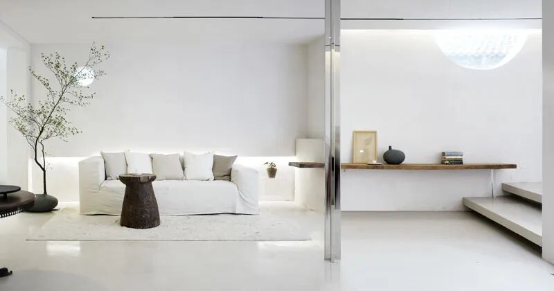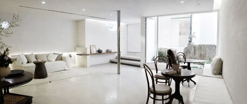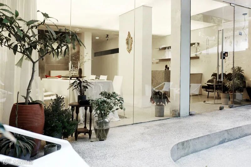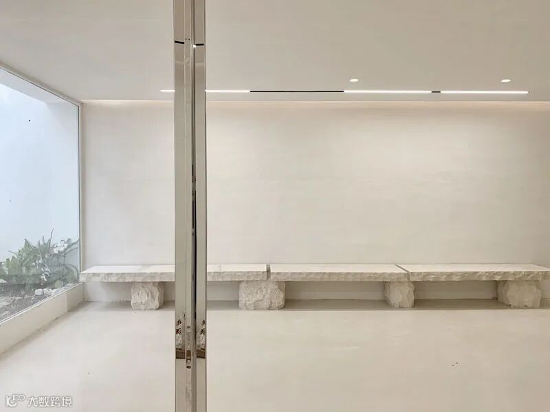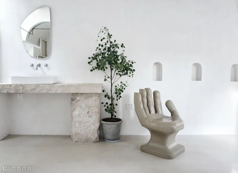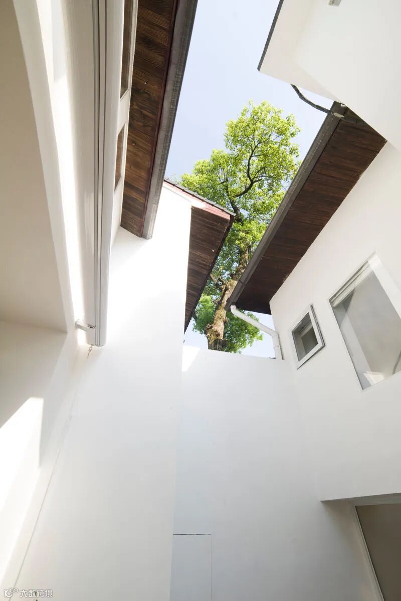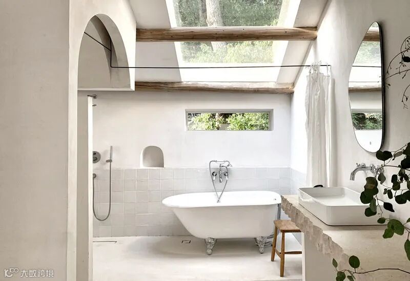 白色的主体色在一定程度上增加了空间的空旷及延伸感觉,在朝向院子及山体的南向,全部用落地玻璃打开,在室内就可以直接面对山林。