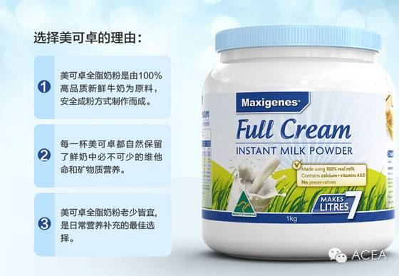 Maxigenes美可卓高钙羊奶粉中含有独特的EGF生长因子,能快速修补老化的皮肤细胞,增使肌肤健康白皙光嫩;Maxigenes羊奶中的免疫球蛋白含量很高可以增强抵抗力,羊乳中维生素C、维生素E,镁非常丰富,能促进胶原蛋白的合成,使肌肤光嫩有弹性,缓解压力,阻止体内不饱和脂肪酸的氧化,延迟皮肤的衰老。现代人面对紧张的工作、沉重的压力,每天喝杯羊奶,可帮助舒缓精神压力,使思想与身体得到休养生息的机会。