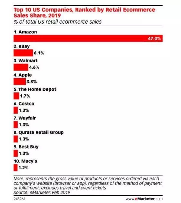 据市场研究机构eMarketer的数据,目前,亚马逊以 47% 的绝对优势占据着美国电商市场的主导地位,排在其后面的 eBay、沃尔玛、苹果,统统不到 10% 。