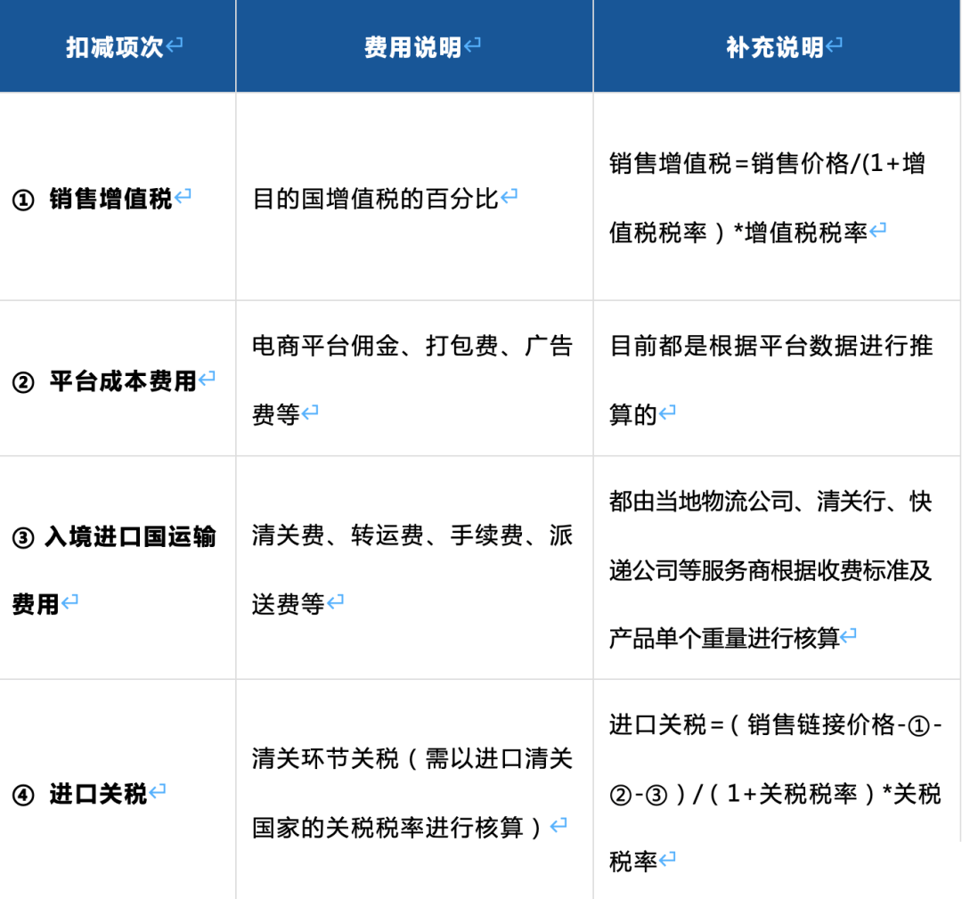 申报不再按照之前销售链接的30%处理,而是以逆算的方式,将一些固定的成本扣除后再做测算。例如销售增值税、平台成本费用、入境进口国运输费用、进口关税等。