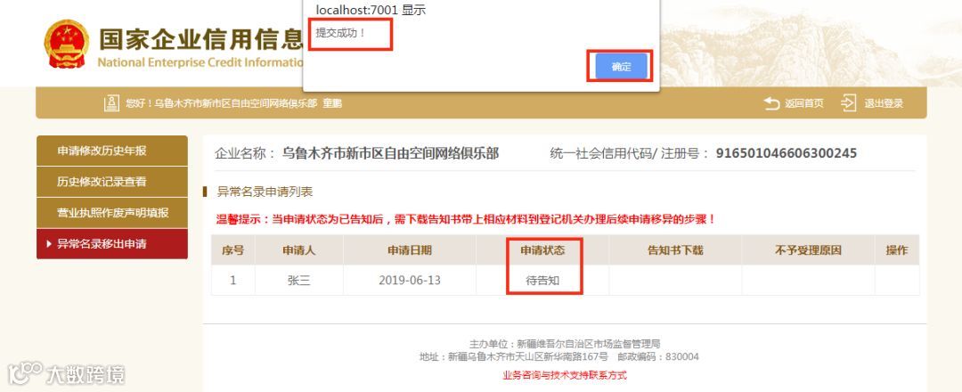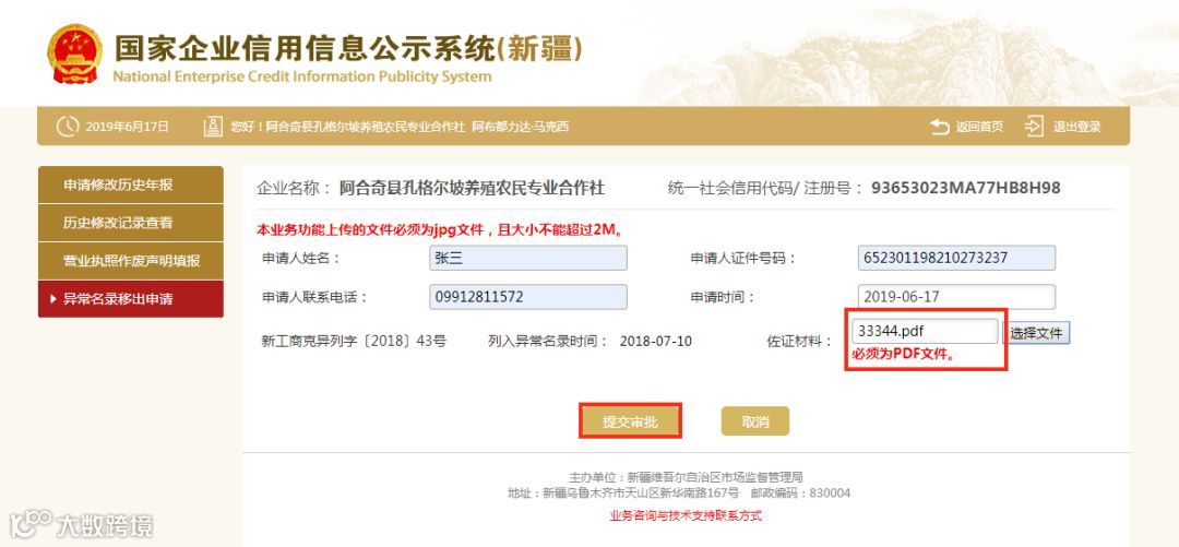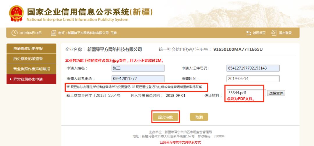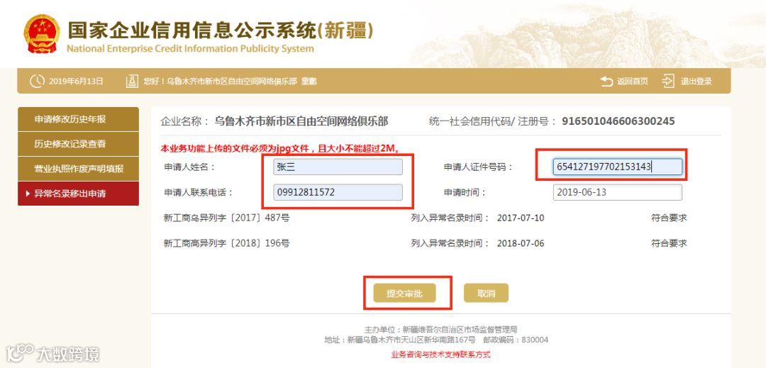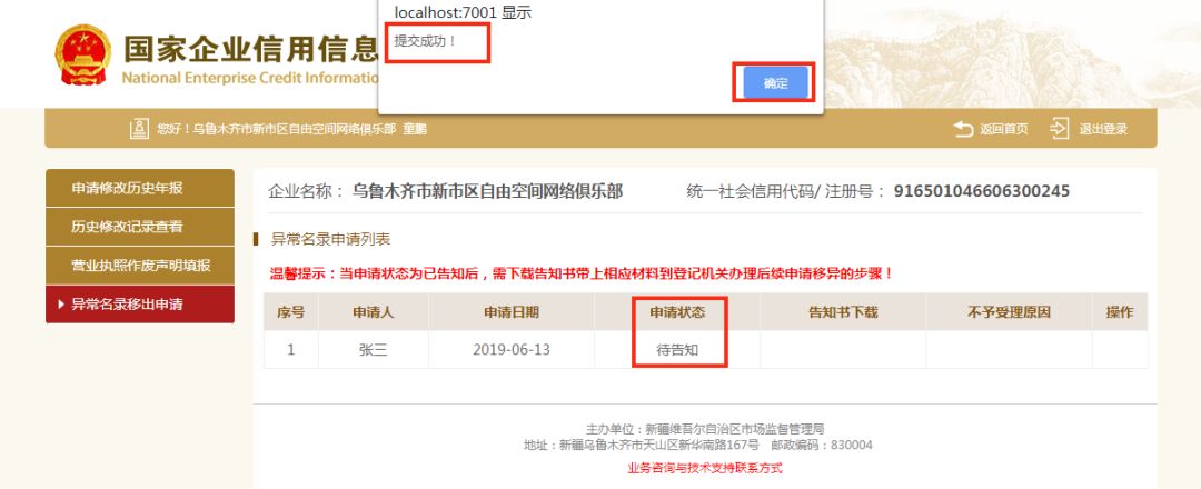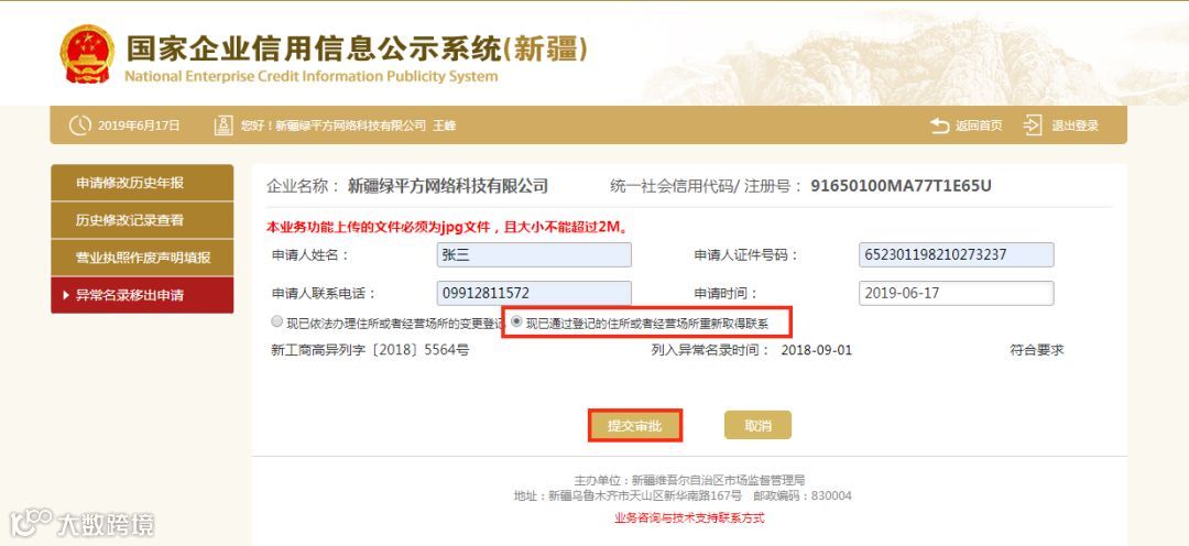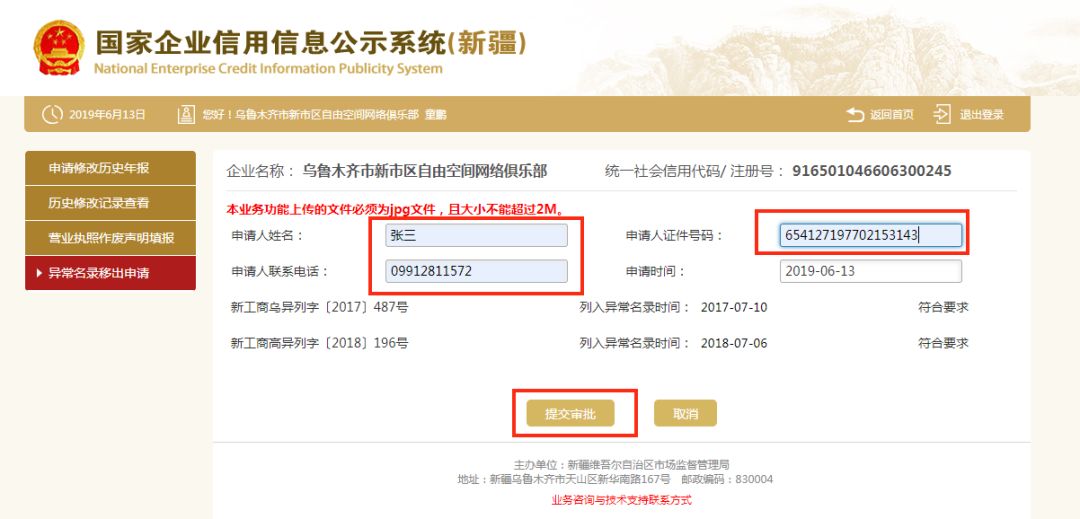 第五步:(因“未按规定公示年报”和“未按规定公示即时公示信息”列入填写)填写申请人姓名,申请人证件号码和申请人联系电话,申请时间系统自动显示,不需填写。确认所填信息无误后,点击“提交审批”。系统提示提交成功,点击确定。