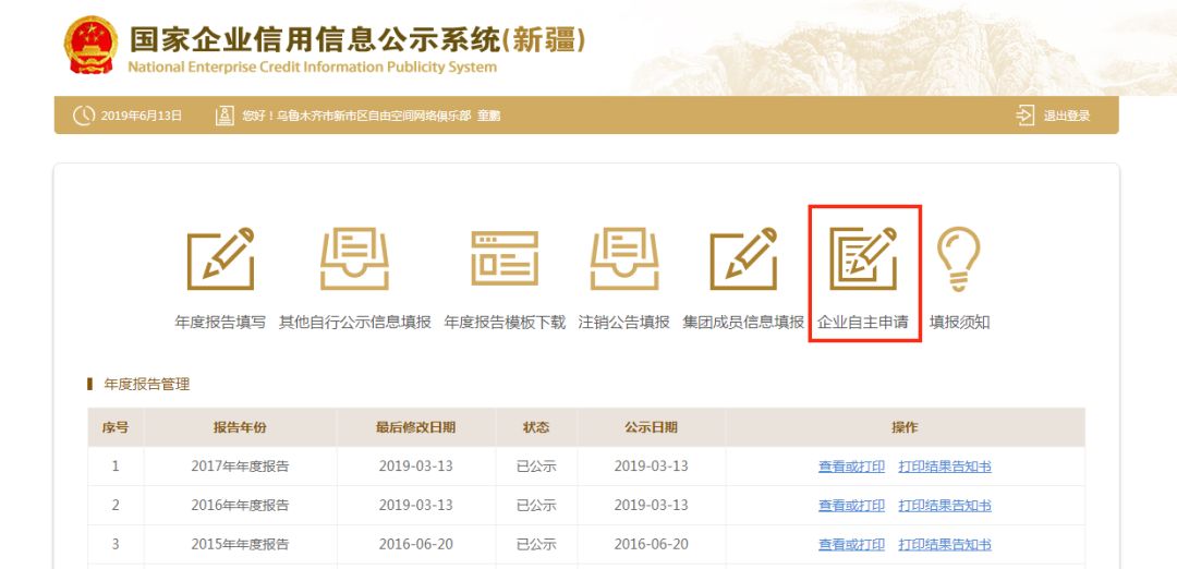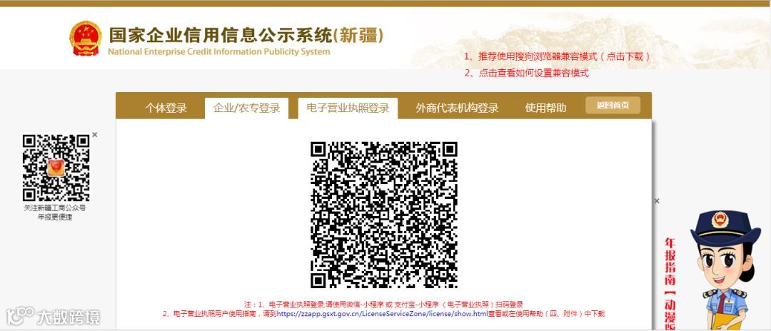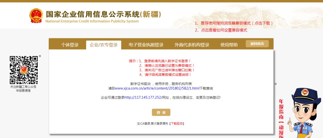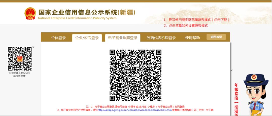 第一步:登陆国家企业信用信息公示系统(新疆)首页面。通过证书或电子营业执照登录。