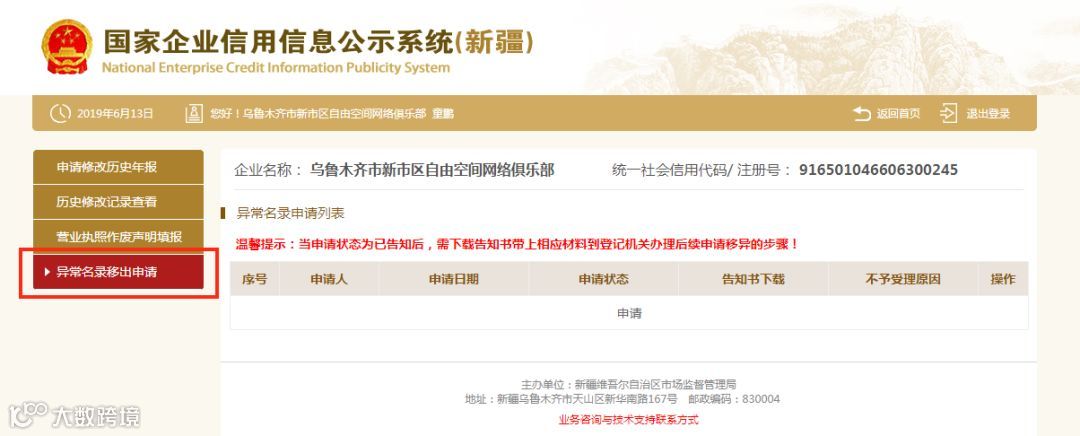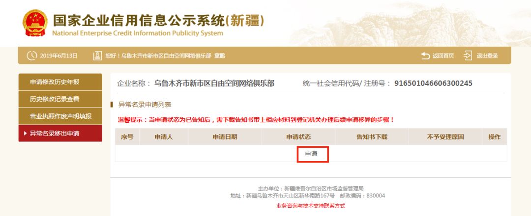 第四步:点击“申请”,进入异常名录移出申请填写页面。