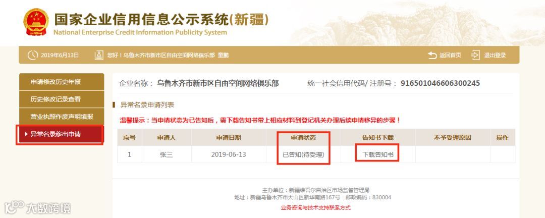 第八步:登记机关操作人员告知主体并生成告知书后,请登录年报系统,下载告知书,按告知书要求带上相应材料到登记机关办理后续申请移异的步骤。
