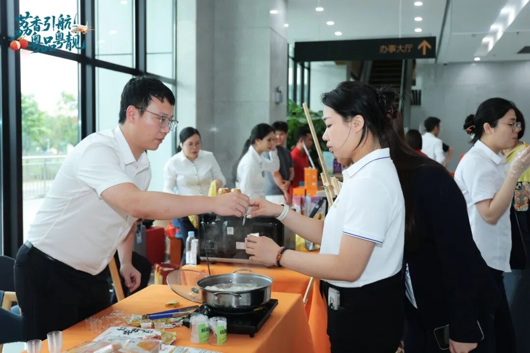 展销会现场,热闹非凡,广州国际航空物流枢纽中心1楼大堂的试吃展区人头攒动。大家穿梭在各个展位之间,一边与参展企业代表交流洽谈,一边品尝着地道的岭南风味。