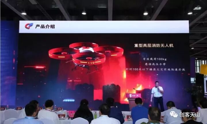 作为获得2017年“创客中国”创新创业大赛全国总决赛创客组三等奖的项目,工业级大载荷消防无人机可以高空携带高压水枪、无后座力空气炮、脉冲水雾炮,可以投掷消防器材、救援器材、喷洒灭火粉等。项目产品实现了远程超控、数据传输,解决了高层灭火的难题,填补了国内外无人机高层灭火的空白。