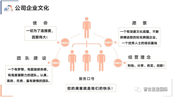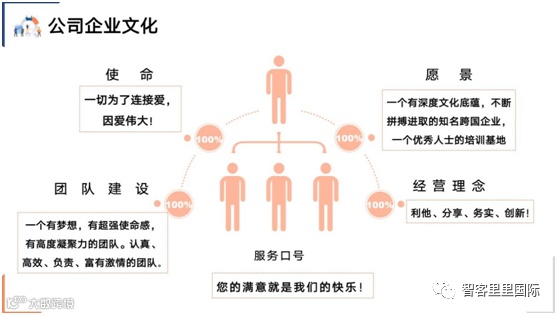 智客公司是一家宣扬爱的公司,这个爱由勇气,好奇,尊重,视觉和空间五个维度组成,爱是无条件的付出。公司吸取了儒,释,道,红色文明和教练技术五家之长,作为公司企业文化的基础,在此之上建立公司自己的价值体系和经营理念“利他,分享,务实,创新!”,目的是成为一家知名的跨国企业,同时也希望培育出更多的优秀人士,用爱将公司和员工紧密连接在一起。