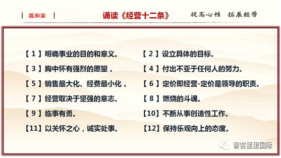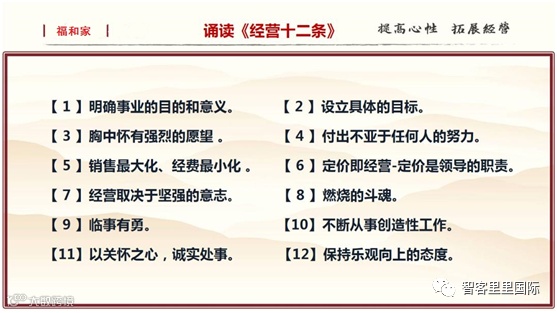 智客里里公司的使命“一切为了连接爱,因爱伟大”和愿景“一家有深度文化底蕴,不断拼搏进取的知名跨国企业。一个优秀人士的培训基地”无一不体现着《经营十二条》的精髓。