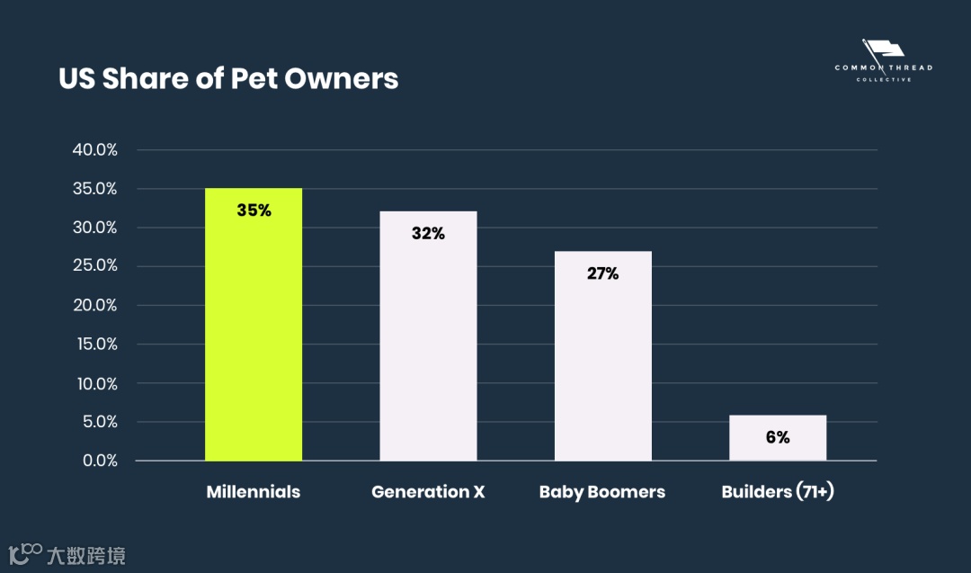 根据 Common Thread Collective 在 2020 年发布的《宠物产业 2020 报告》,美国的主力养宠人群已经从其他年龄段的人群转变为千禧一代。而与婴儿潮一代人相比,千禧一代在社交媒体上活跃的比例是婴儿潮一代的接近 2 倍(分别为 90.4% 和 48.2%)。