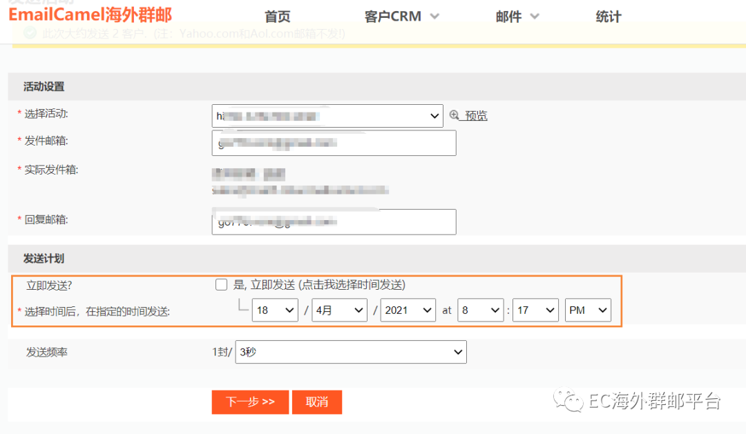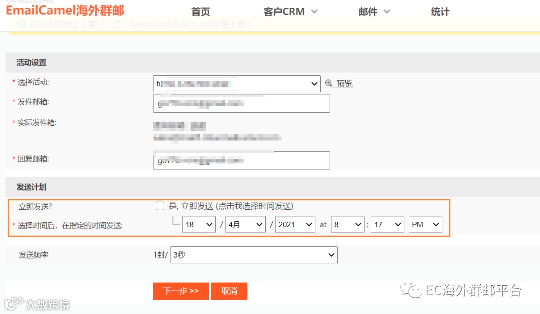 EmailCamel海外群邮EDM系统,一个是解决当日发信量的难题,另外也提供自定义发送时间。模拟人工一对一发,单显。
