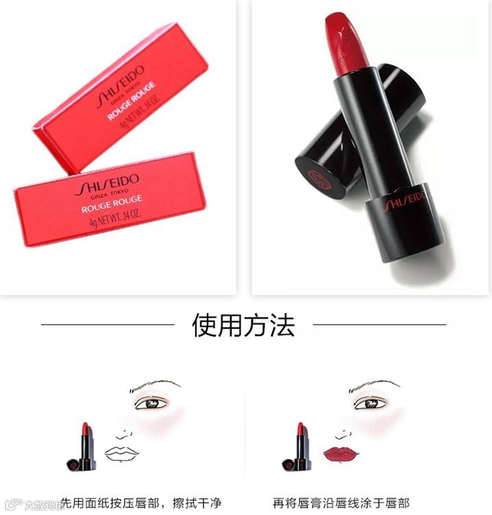 最后一步是整个妆容的点睛之笔,口红的颜色可根据自己的肤色和场合来选择。在这里只推荐一款百搭的颜色吧!资生堂甄红口红,它的颜色真的很正,红出个性,自然持久光泽。