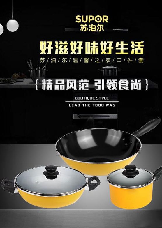 SUPOR 苏泊尔三件套装 炒锅汤锅奶锅厨房组合套装锅铁锅T1360T 柠檬黄