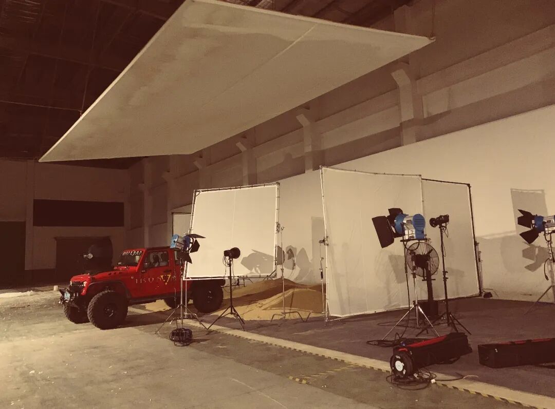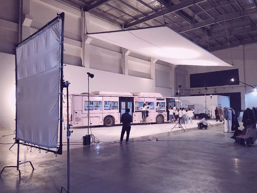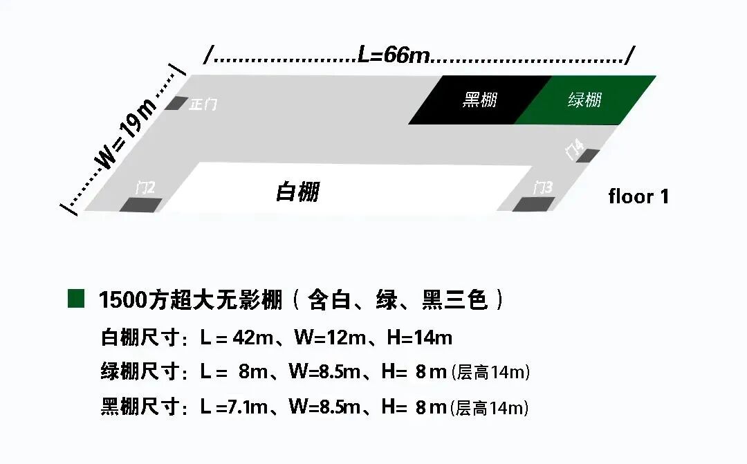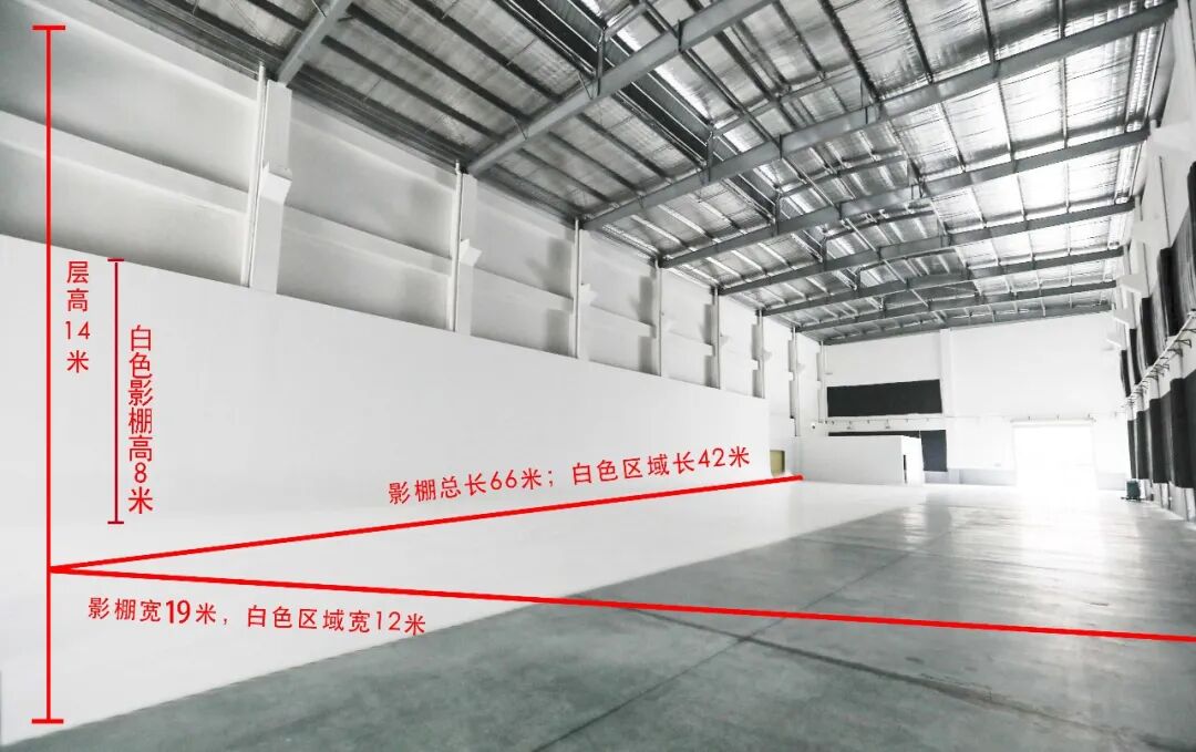 影棚面积:棚长66m、宽19m、挑高14m(卡车方便自由进出)含白色、绿色、黑色三种颜色,适合大型影视置景、汽车棚拍、艺人杂志、节目访谈、MV广告、淘宝电商、企业集体照、活动秀场、发布会、订货会、艺术展等使用。