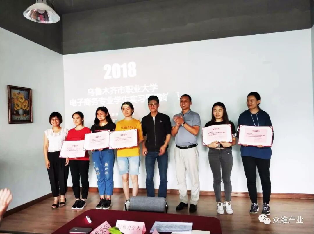 2018年6月13日下午,在E工厂培训室举办阿力麻里商学院优秀实习生表彰大会。新疆众维股份总经理曹建山、阿力麻里电商代运营服务中心运营总监马天俊为乌鲁木齐市职业大学电子商务专业武宁等5名实习生颁发2018年“阿力麻里商学院优秀实习生”荣誉证书。