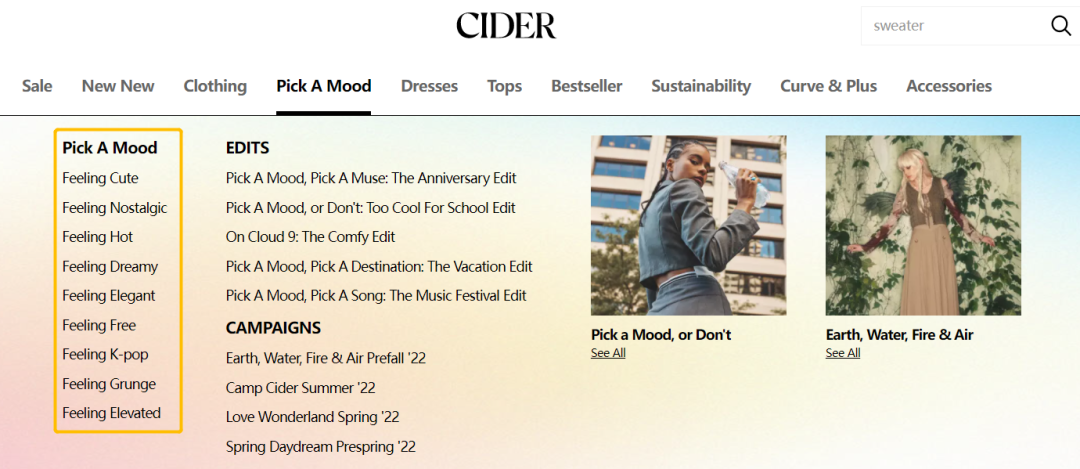 在产品分类上,除了传统的按衣服功能的分类外,还专门设立了按情绪和按场景分类的标签,非常贴合Z时代的消费习惯,帮助用户能够更快、更精准地找到心仪的服饰。