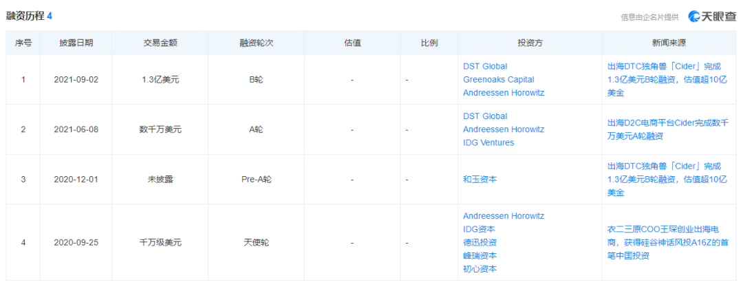 成立于2020年,独立站月均访问量超5百万,在一年内便成功融资四轮,估值已超过10亿美金,成为目前全球最快跻身独角兽行列的公司之一的Cider虽体量上与Shein无法相提并论,但其发展迅速已足够优秀被称之为“Shein后浪”。