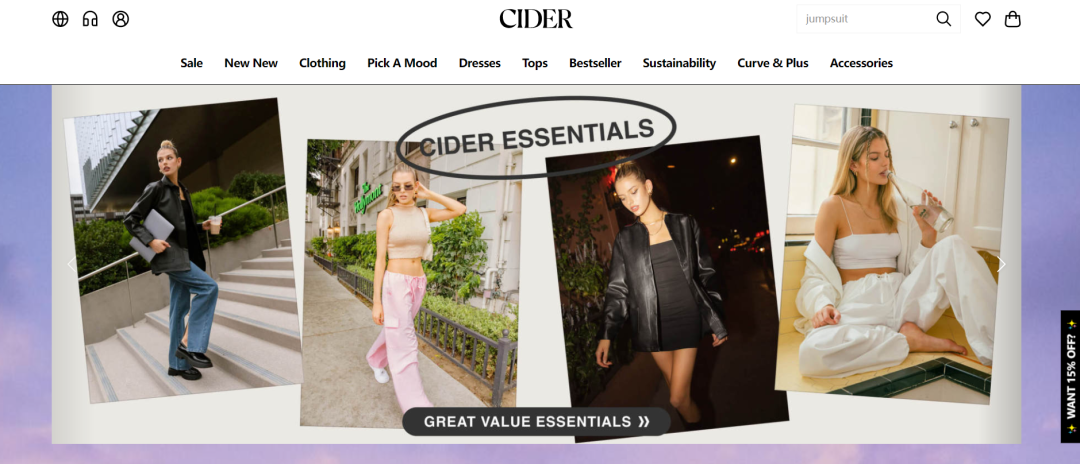 Cider的独立站主页界面简约清爽、风格彰显年轻化。相较于Shein的天天低价,Cider上的衣服定价普遍更高一些,集中在20-40美元区间,但从用户的测评反馈来看,衣服质量相对更好、时尚品牌的印象也更深。