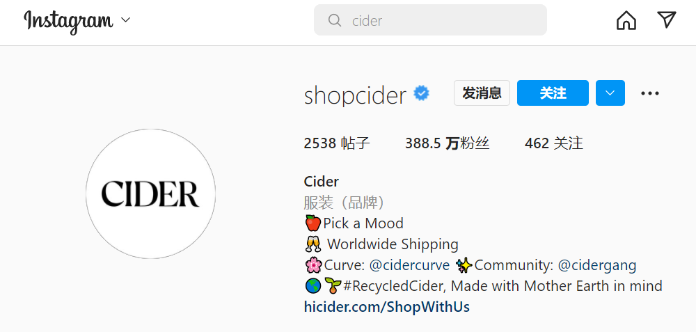 在营销方面,利用社交媒体发布网红或品牌模特的照片以及一些推广视频,在Tiktok、Instagram和Pinterest这些海外平台上,关于#Cidergang的话题每天都有数千条的发布。Cider的Facebook主页拥有98万关注者,Cider的Instagram账号则积累了388.5万粉丝,用户遍布全球100多个国家。