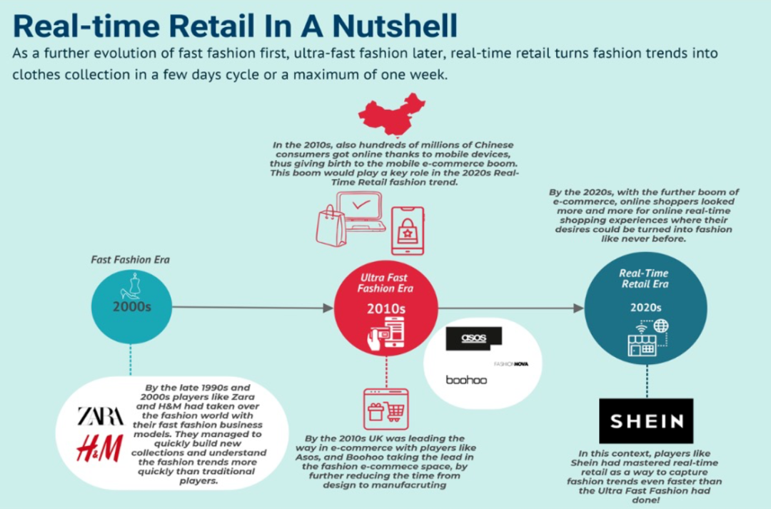对于传统零售商,完整地走完这个生产环节,涉及制造工厂、批发商、分销商、零售商等多个环节,需要6-9个月;对于Zara、H&M等传统快时尚厂商需要3-4周;对于Shein、Cider则只需要5-7天。
