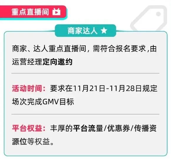 据悉,今年黑五期间,TikTok官方将对重点直播间进行扶持,凡是商家、达人重点直播间,符合报名要求,将由运营经理定向邀约,只需根据场次完成GMV目标,可获得丰厚的平台流量、优惠券、传播资源位等权益。