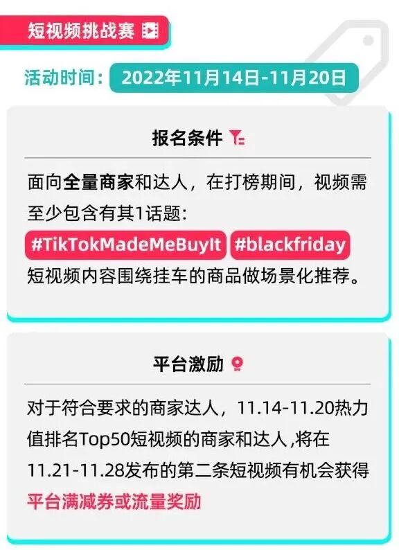 该活动面向全量商家和达人,在打榜期间,视频需至少包含有其中1个话题:#TikTokMadeMeBuylt、#blackfriday,短视频内容围绕挂车的商品做场景化推荐。