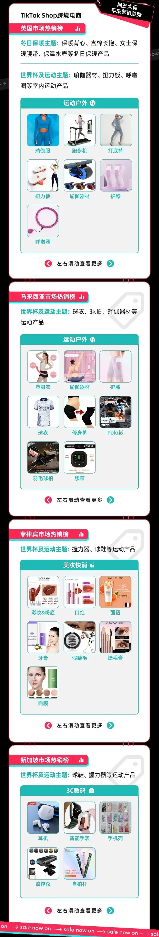由于此次TikTok Shop的“黑五”大促并没有覆盖全部站点,为帮助卖家在大促期间,实现更好的品牌宣传和效果转化,TikTok Shop平台方面也公布了英国、马来西亚、新加坡、菲律宾各国站点的热销榜单,以下为各国(部分)黑五营销趋势。