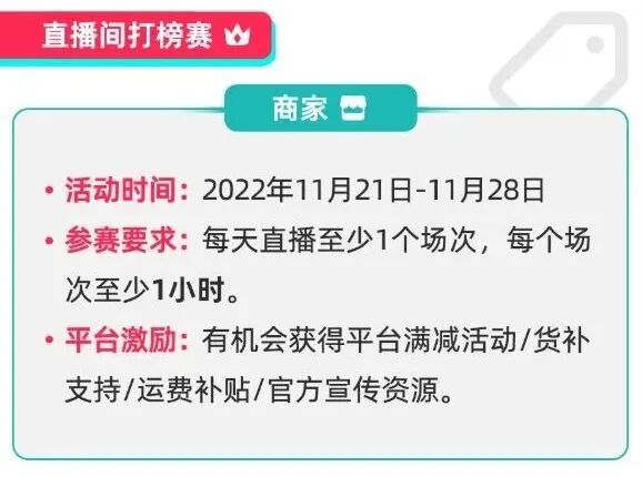 商家端,需要每天直播至少1个场次,每个场次至少1小时,平台将设置激励项目,有机会获得包括平台满减活动、货补支持、运费补贴、官方宣传资源。