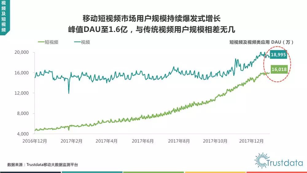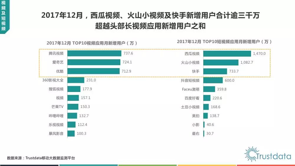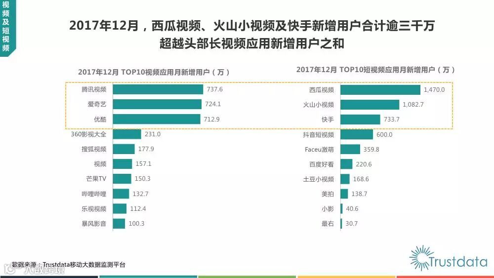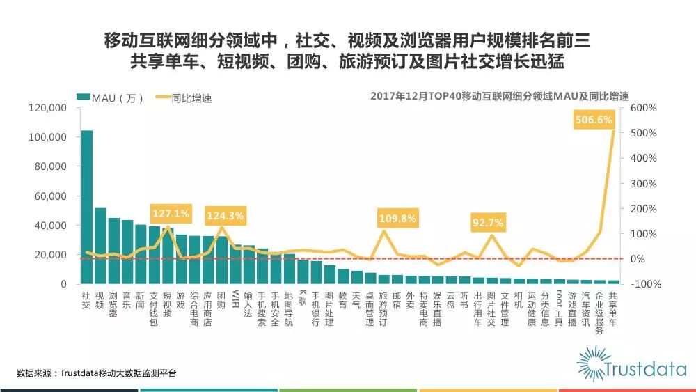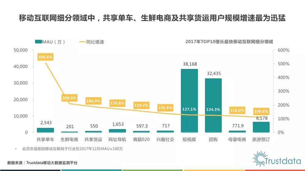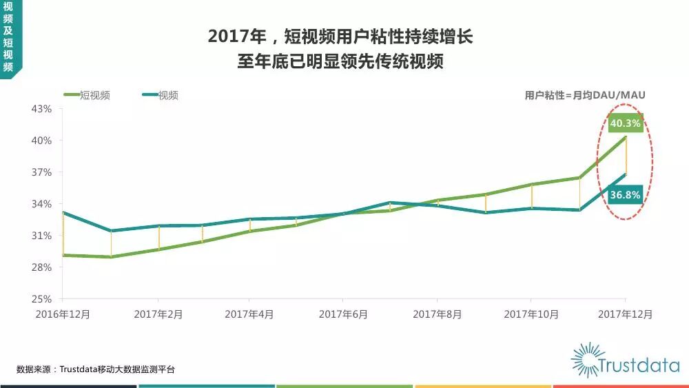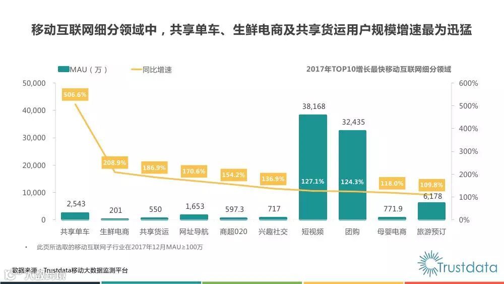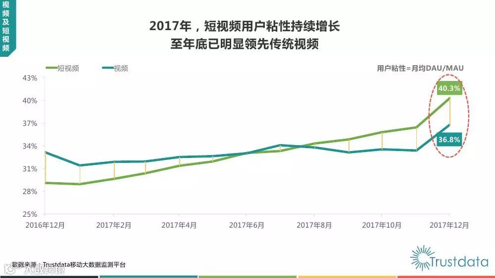 近日,移动互联网大数据监测平台Trustdata发布2017年中国移动互联网行业发展分析报告。针对移动互联网重点细分领域进行多维度解读,并对共享单车、短视频等17年话题性领域重点分析。报告中指出,短视频领域以127.1%的增速位列第二,仅次于共享单车,并且以40.3%的用户粘性于今年中旬首次超越视频领域,成为市场"新宠"。
