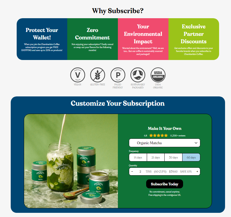 Chamberlain Coffee独立站的订阅方案,根据客户需求进行定制,如自定义产品类型、使用频率、数量等。订阅成功后,客户将获得免运费、独家折扣、免费送货上门、最高八折优惠等福利,可通过在线聊天工具修改订单信息,订阅可随时取消。