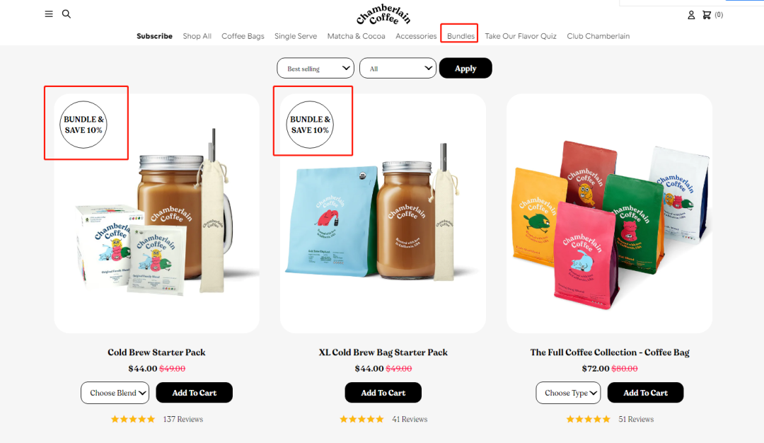 Chamberlain Coffee独立站上有一个“Bundles”专栏,意为“捆绑”,里面包含了咖啡礼盒套装、多口味咖啡袋、咖啡用品与咖啡套装等,产品具有一定的折扣优惠,满足消费者的多样需求,同时还能提高产品的平均单价。