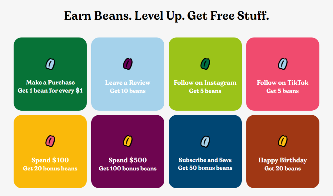 1/创建账户,在网站每购买1美元即可获得1颗豆子;2/发表评论,获得10颗豆子;3/关注Instagram,获得5颗豆子;4/关注TikTok,获得5颗豆子;5/花费100美元,获得20颗奖励豆;6/花费500美元,获得100颗奖励豆;7/订阅并保存,获得50个奖励豆;8/生日,获得20颗豆子