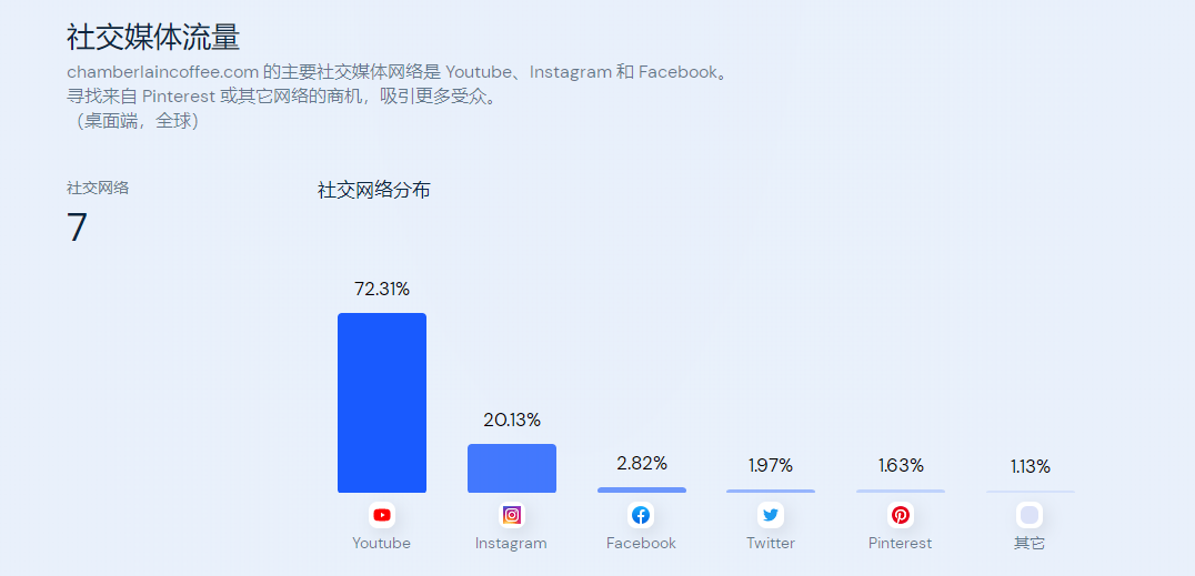 主要社交媒体网络是Youtube和Instagram,YouTube占比72.31%,Instagram占比20.13%,此外涉及了Facebook、Twitter、Pinterest等其它社交平台。