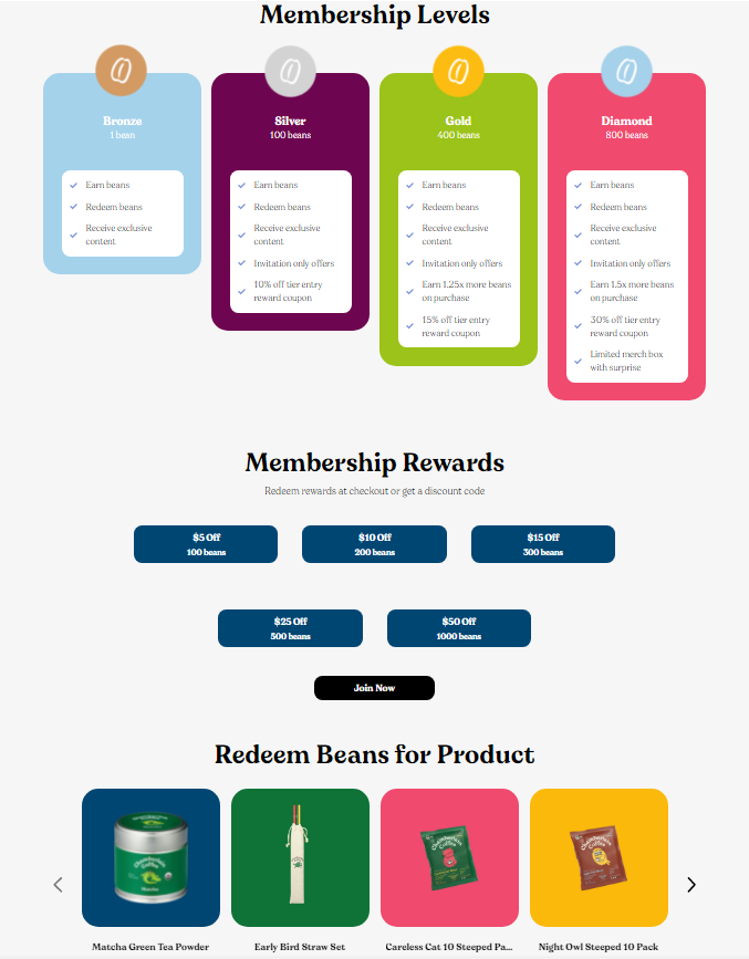 Chamberlain Coffee独立站利用一个包含了会员等级、会员奖励、豆子兑换的会员系统进行营销去激活、留存用户,将独立站与社交平台账号打通,提升用户的复购率。