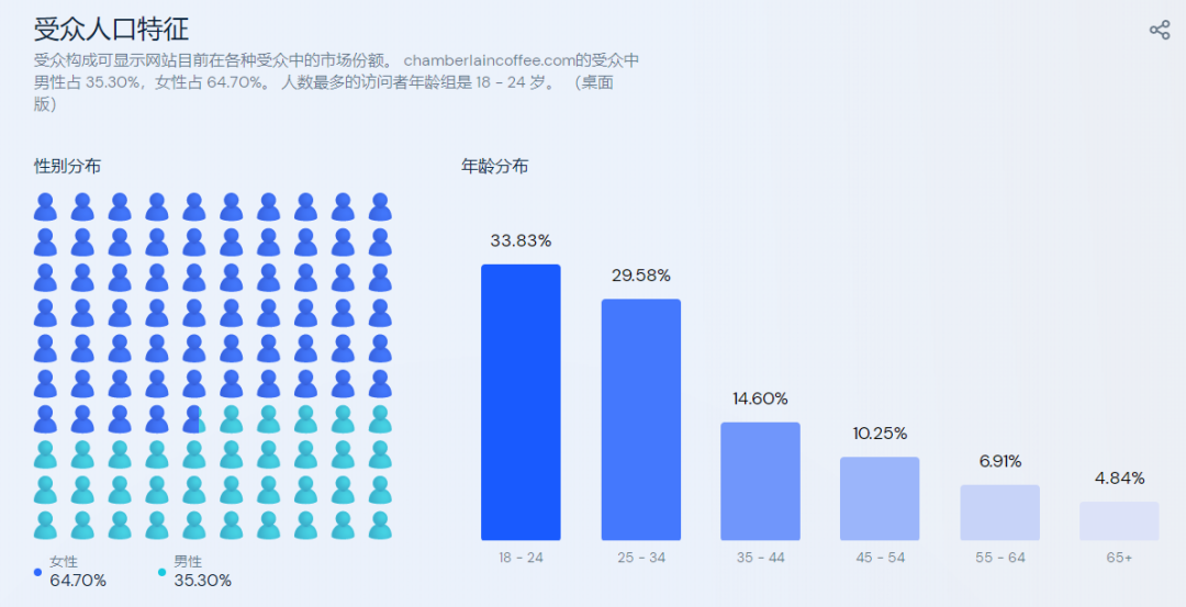 据similarweb对Chamberlain Coffee独立站的统计,chamberlaincoffee.com的受众中男性占35.30%,女性占64.70%。人数最多的访问者年龄组是18-24岁。该年龄段的人群更能与品牌产生共鸣,他们更受数字驱动影响,更倾向于可持续性产品。