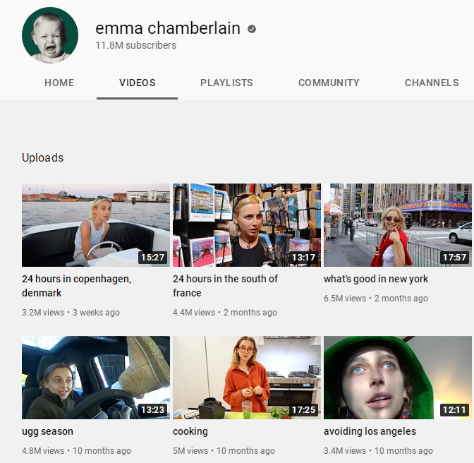 Emma Chamberlain是活跃于YouTube的Z世代网红博主,凭借其真实、平易近人而有趣的日常、旅游、DIY短片爆红,在YouTube拥有1180万的用户订阅,在Instagram拥有1610万的粉丝关注。