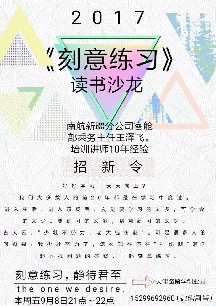本周五澳大利亚英语课后福利,特邀请到南航新疆分公司客舱部乘务主任王泽飞,培训讲师10年经验,带领大家开展《刻意练习》读书沙龙,本周五21点~22点免费好活动速度报名参加哦,留学创业园E工厂不见不散。