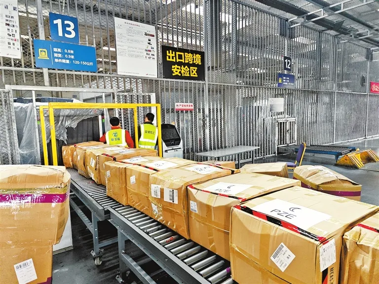 下午,记者来到郑州机场国际快件中心时,3万平方米的场地外,十几辆大货车正排队卸货,6条安检线满负荷运转。张祎说,高峰期时,这里每天处理跨境电商包裹和国际快件近600吨。